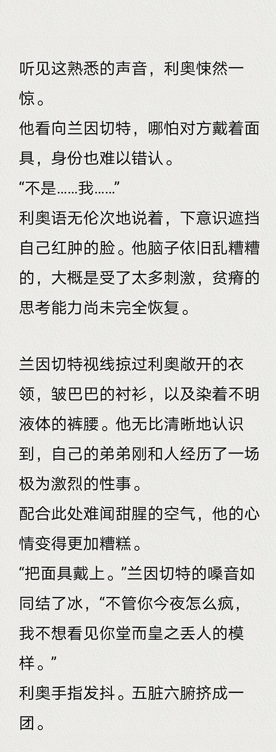 旁边客房里的男女大概已经结束了交媾,再没传出什么动静。兰因切特捏着纸质文件,快速下楼离开,不想在这里多呆一分一秒。被抛下的利奥迈着僵硬的双腿,回房找到自己的眼罩面具,去楼下寻找女伴伊芙。